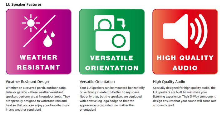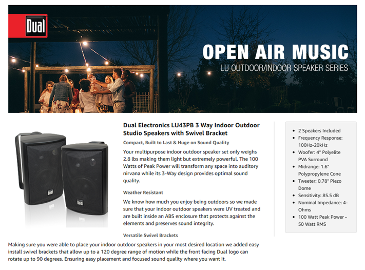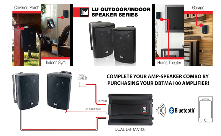 The Dual Electronics LU43PB 4 inch 3-Way High Performance Indoor, Outdoor & Bookshelf Studio Monitor Speakers with Swivel Brackets & 100 Watts Peak Power will make a great addition to any home. Your pair of 4” 3-Way high performance speakers will enhance any sound system and make acoustic waves regardless of placement. Their compact but efficient design provides you with 100 Watts of Peak Power, 50 Watts RMS, 4-6 Ohms and Frequency Range between 100Hz-20kHz for unrivaled sound superiority. The versatile swivel brackets allow your speakers to be installed on the wall or ceiling with a 120 degree range of motion or in a vertical or horizontal placement with a 90 degree range of motion for accurate high fidelity sound where you want it.We understand how unpredictable the weather outside can become so we took all necessary precautions. Your Dual Electronics speakers are coated with a UV resistant resin and placed inside an ABS enclosure protecting it from the elements and preserving sound integrity making them great patio speakers. When designing your LU43PB high performance speakers we included all the components for high quality long lasting sound. That includes a 4 inch woofer for low sounding bass, 1 inch Midrange Polypropylene Cone providing better heat resistance and enhancing your music experience and the ¾ inch Tweeter that produces reliable high audio frequencies for unrivaled sound performance.