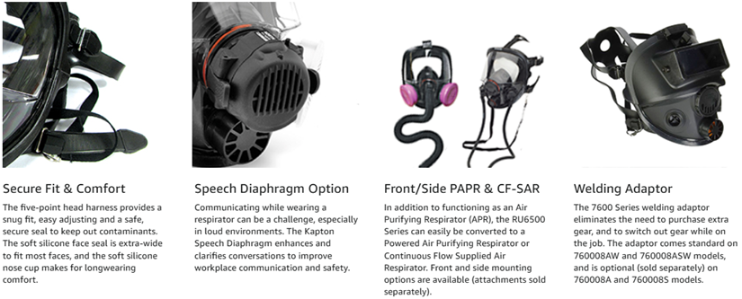 Special Features | Cartridges and filters sold separately, Safety Products, Can be adapted to PAPR or Supplied Air| Also available with a welding attachment. | Speech diaphragm is standard| Dual flange sealing area| Five strap head harness| Nose cup is standard| Chin cup helps to position the facepiece properly| Latex free. | Lens offers 200o field of vision, plus downward view| Polycarbonate lens meets ANSI high impact requirements |