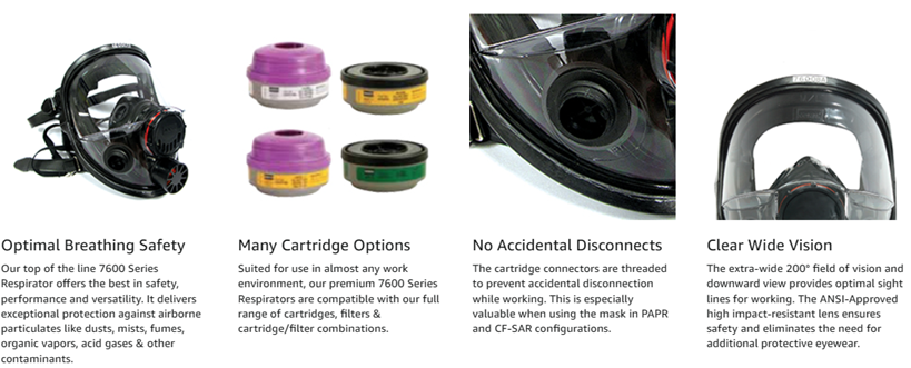 This Honeywell North 7600 Series Full Facepiece Silicone Respirator offers premium safety, comfort and performance. It delivers strong protection against particulates, dusts, fumes, mists, organic vapors, acid gases & other contaminants, and is compatible with our full range of cartridges, filters & cartridge/filter combinations to suit almost any work environment. In addition to functioning as an air purifying respirator (APR), the 7600 model also features front and side mounts for easy transition to a powered air purifying respirator (PAPR) or a continuous flow supplied air respirator (CF-SAR). A welding adaptor is also available, which eliminates the need to purchase extra gear and to switch out gear while on the job (adaptor not included). The full face respirator features a soft silicone nose cup for longwearing comfort on the job. The silicone face seal provides an excellent contaminant barrier, and the threaded cartridge connector prevents accidental disconnection. A five-point head strap option includes a center strap for quick adjusting and a more secure fit. The tough polycarbonate lens offers a wide sightlines, downward viewing, optical clarity and distortion-free vision. The ANSI-Approved lens is designed to withstand high impacts, eliminating the need for additional eye protection. Suitable for use as a paint respirator, paint spray mask, welding respirator, chemical mask and other applications.