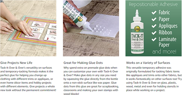 Aleene's Tack It Over and Over gives you a temporary bond, so it’s the perfect way to use appliqués over and over. So you can create a themed shirt for the school play, then remove the appliqué after the performance. Or maybe you want to “dress” a sweater for a holiday theme, then wear it plain throughout the season. Sticks to most surfaces, including fabric, wool, paper, metal, glass and plastic.