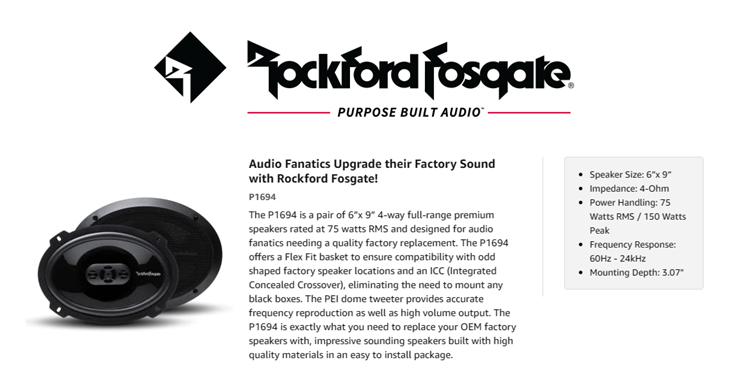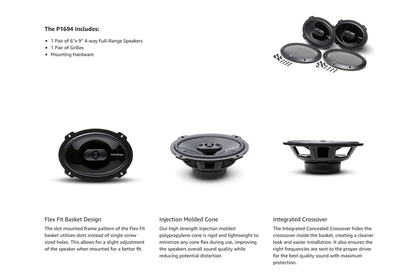 • The P1694 6”x9” 4-Ohm black speakers come as a pair, have a power handling of 75 Watts RMS/150 Watts Max and include grilles, mounting hardware and OEM adapter plate