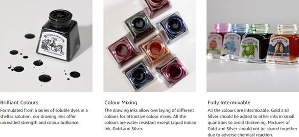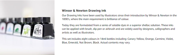 Our Drawing Inks have been used by illustrators since their introduction by Winsor & Newton in the 1890's, where the main requirement is brilliance of color. Today they are formulated from a series of soluble dyes in a superior shellac solution. These inks can be applied with brush, dip pen or airbrush and are widely used by designers, calligraphers and artists as well as illustrators. This is an introductory selection of 8 colors in 14ml bottles. Includes: Canary Yellow, Orange, Carmine, Violet, Blue, Emerald, Nut Brown, Black. Actual contents may vary.