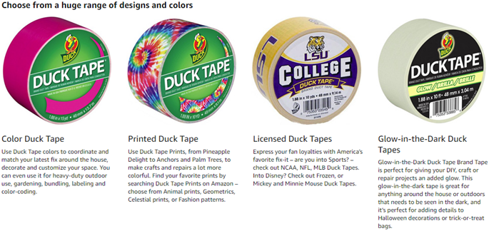 Almost everyone has a Duck Tape story to tell, usually praising its remarkable strength and versatility. Duck Brand duct tape has a wide range of applications, both traditional and nontraditional, and is now available in dozens of colors and patterns, making it even more useful than ever! Because of its strength and adhesive properties, you can use Color Duck Tape for almost any job, including everyday household and auto repairs--anywhere a flexible and weather-proof bond is needed. Great for temporary indoor floor marking and removes cleanly from most surfaces up to 3 weeks. Not recommended for hardwood floors or in direct sunlight. Color Duck Tape is great for coordinating materials, color-coding and identification, craft applications, and more. This heavy duty tape is cotton mesh reinforced, but still easy to tear! Duck Tape conforms to both smooth and uneven surfaces, and can be used on materials such as cloth, vinyl, leather and plastic - even metal and laminates. Duck Tape is great for any repairs - anywhere!