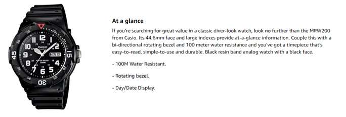 If you're searching for great value in a classic diver-look watch, look no further than the MRW200 from Casio. Its 44.6mm face and large indexes provide at-a-glance information.Couple this with a bi-directional rotating bezel and 100 meter water resistance and you've got a timepiece that's easy-to-read, simple-to-use and durable. Black resin band analog watch with a black face