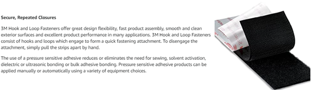 This hook and loop product constitutes a 100 mil to 160 mil engaged thickness and uses a 3.0 mil white polypropylene film liner printed with our red 3M logo. Hook and loop fasteners are effective for securing fabric to furniture cushions, airplane seating, carpet panel attachments, uniforms, gloves and clothing. These types of applications are widely utilized in electronics, construction, specialty vehicle, military, medical, furniture, as well as general industrial operations where securing surfaces that can be unfastened and refastened thousands of times with no bulging rivets, screws or bolts is desired.