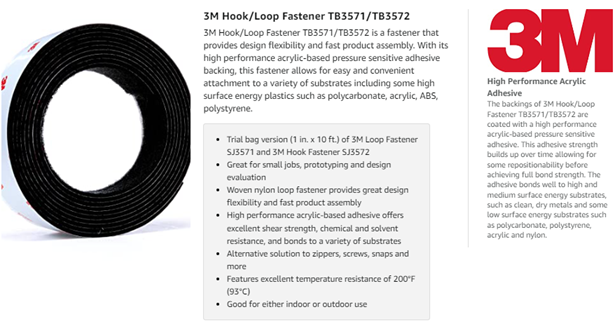 3M Hook/Loop Fastener TB3571/TB3572 is our best in class fastener that provides design flexibility and fast product assembly. With its high performance acrylic-based pressure sensitive adhesive backing, this fastener allows for easy and convenient attachment to a variety of substrates including some high surface energy plastics such as polycarbonate, acrylic, ABS, polystyrene.