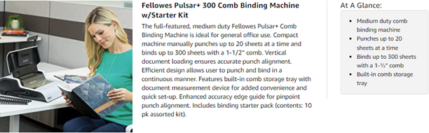 The full-featured, medium duty Fellowes Pulsar Plus Comb Binding Machine is ideal for general office use. Compact machine manually punches up to 18 sheets at a time and binds up to 300 sheets with a 1-1/2-Inch comb. Vertical document loading ensures accurate punch alignment. Efficient design allows user to punch and bind in a continuous manner. Features built-in comb storage tray with document measurement device for added convenience and quick set-up. Adjustable edge guide centers documents with ease. Includes binding starter pack (contents: 10 pk assorted kit).