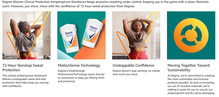• GO BEYOND YOUR LIMITS: At Degree, we want to inspire confidence in everyone to move more and go further. We’re here to support your journey through an antiperspirant for women that moves with you