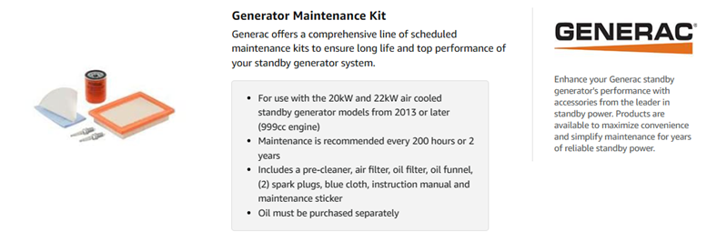 The Generac 6485 Maintenance Kit is for standby home generators with 20-Kilowatt 999cc engines. Scheduled maintenance is a necessity for all standby generators. The Generac 6485 Air Cooled Scheduled Maintenance Kit offers all the hardware necessary to perform maintenance on your Generac air-cooled generator. Maintenance is recommended every 200-hours or 2-years and if your generator is running in a dusty environment a more frequent maintenance schedule may be required. The Generac 6485 Maintenance Kit contains a pre-cleaner, air filter, oil filter, oil funnel, (2) spark plugs, blue cloth, instruction manual and preventative maintenance reminder sticker. Further maintenance details can be found in the generator's owners manual. Generac manufactures the widest range of power products in the marketplace including portable, RV, residential, commercial and industrial generators. At Generac, we protect the things that power your life by providing quality, affordable power solutions.