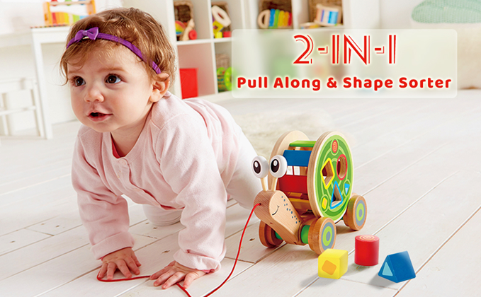 This multi-tasking snail tows a shell full of wooden blocks as he tags along behind you, waving his tail. Kids ages 12 months to kids of 5 years can lighten the load by removing the colorful shape sorter, and getting him ready to roll alone.