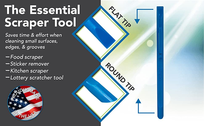 - No-Scratch Super Scraper - One side of your Scrigit Scraper tool has a flat edge that's best for flat surfaces and larger areas. The other side has a round edge, best for curved surfaces and smaller areas. Dishwasher safe and easy to hold, just like a pen.