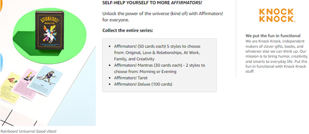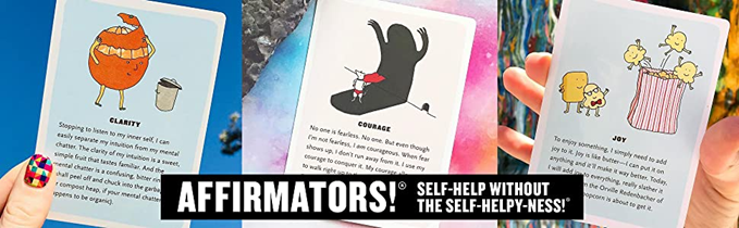 Even pessimists like a little positivity, so comedian Suzi Barrett created Affirmators inspirational-but-not-cheesy affirmation cards. Providing the fun of a horoscope with a little less woo-woo, and full of positive affirmations, this whimsical box will help you help yourself, no shamanistic consult required! Cheer up gift for anyone seeking a little self-help (without the self-helpy-ness). 3.75 x 5 inches; 50 cards, plus instruction card. Conceived and written by Suzi Barrett. Knock Knock is an independent maker of clever gifts, books, and whatever else we can think up. Our mission is to bring humor, creativity, and smarts to everyday life. Put the fun in functional with #knockknockstuff.