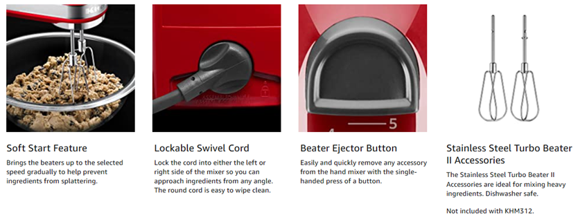 The KitchenAid KHM512ER 5-Speed Hand Mixer is the perfect go to for nearly all of your mixing needs. Five speeds and two stainless steel Turbo Beater Accessories provide you with the power and control to mix up your favorite cookie dough, mash potatoes and so much more.