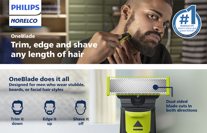 The Philips Norelco OneBlade is a revolutionary new electric grooming technology designed for men who wear facial styles, beards, or stubble. OneBlade trims, edges, and shaves any length of hair. The unique OneBlade shaving technology integrates a fast moving cutter (200x per second) with a dual protection system to give you an efficient comfortable shave on longer hairs. OneBlade does not shave too close, so your skin stays comfortable. The replaceable OneBlades last up to 4 months* (*For best shaving experience. Based on 2 full shaves per week. Actual results may vary.) Subscribe & Save on Philips Norelco OneBlade replacement blades and save up to 15%.
