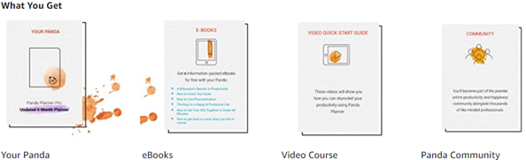 • ★ BONUSES & guarantee - included with your Panda Planner are some incredible eBooks (on topics like “how to crush your goals” and “a billionaire’s guide to productivity”) and a video mini-course on how to skyrocket Your productivity. If you don't feel happier and more productive, just reach out to us for a simple, no-hassle Refund