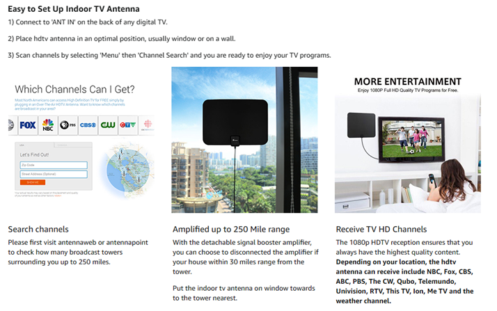 - Detachable Amplify And Boost Signaler - HD antenna amplifier is included to provide added range and maximum signal reception for more channels if you are far away from broadcast towers. This is an amplified TV antenna. If a signal cannot be received with the external amplifier, remove the antenna amplifier and try again.