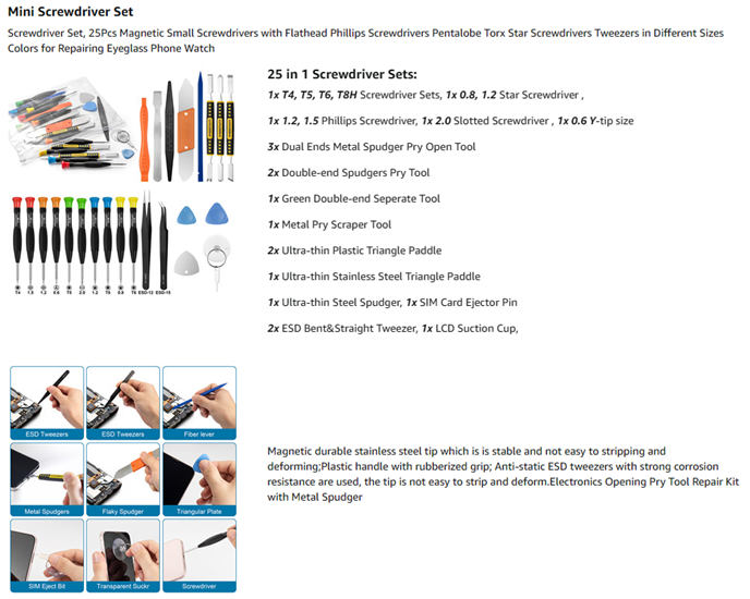 - 【 Multipurpose repair tool kit】: phone computer tool kit set is for different digital products,such as Mobile Phones(iPhone 4,5,5s,6,6s,7,8,plus,Xs,Xs Max,Xr,SE for p5,p6 pentalobe scrwedriver Samsung/LG/HUAWEI/Google/HTC),t5 torx ,t6 torx,ph000 scrwedriver for Computer/PC/Laptop/Desktop(HP,ASUS,Lenovo,Apple Macbook/Macbook Air/Macbook Pro,Imac/Imac Pro),Tablet/ iPad mini/iPad Pro,SLR Cameras,Game Console(PS4, Xbox, Nintendo),Game handle/joystick and other electronic devices