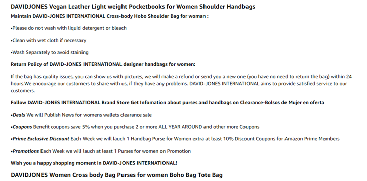 DAVIDJONES:a brand comes from Paris since 1987.Selling Handbags for Women and Girls in More than 100 countries.Great stylish and Convertible Womens Purses.Excellent craftsmanship and refined premium quality leather like PU bags.Decent high end women handbags with affordable price.