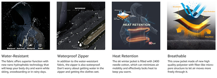 WATER REPELLENT: Professional water repellent jacket, keep your body always dry and comfortable, you won't worry about getting wet while skiing, snowboarding, hunting, hiking in inclement weather.