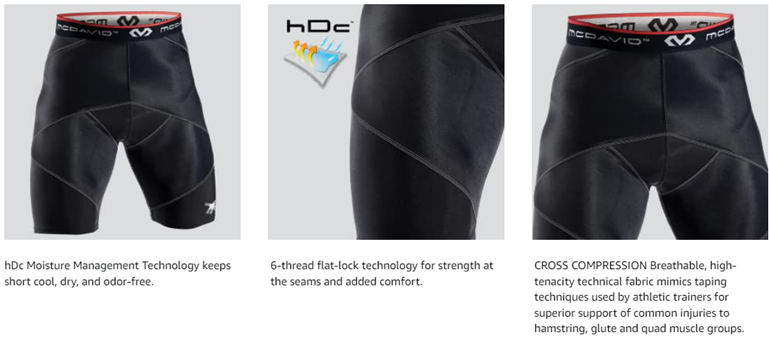 • DESIGN: Exclusive McDavid Cross Compression Technology warms and stabilizes muscles by mimicking taping methods used by athletic trainers, adding support to hamstrings and quads; 6-thread flat-lock technology for strength at the seams and added comfort
