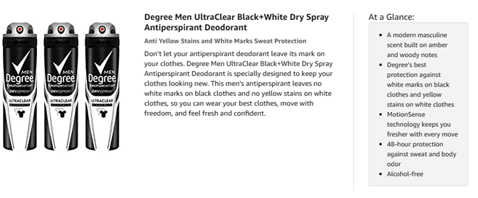 Degree Men UltraClear Black + White Antiperspirant Deodorant Dry Spray with long-lasting MotionSense technology goes on instantly dry for a cleaner feel and is specially designed to keep your clothes looking new. No white marks on black clothes and no yellow stains on white clothes. You'll look great all day and free from deodorant stains. This antiperspirant for men has a formula that cuts down on the stains that some antiperspirants leave behind when they mix with sweat and natural oils produced by your body. It also provides 72-hour sweat and odor protection and goes on instantly dry to keep you moving and free to live life to its fullest. This antiperspirant deodorant spray also contains Degree's innovative MotionSense technology. It works like this: unique microcapsules sit on the surface of your skin. When you move, friction breaks those microcapsules, and they release more fragrance. So, every time you move, Degree keeps you fresh and free from odor. At Degree, we're doing everything we can to help keep the planet moving. That's why our antiperspirant deodorant dry spray cans are made with infinitely recyclable aluminum.