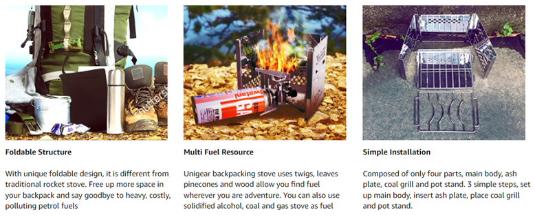 - Portable and Ultra Compact: Unigear camping stove made with stainless steel, which can be folded like a book, and come with a carrying bag for your easy carry. Perfect for camping, hiking, backpacking.