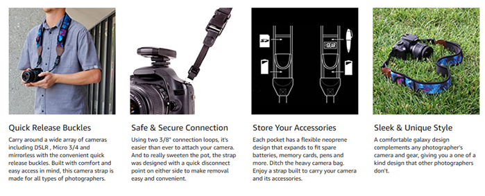 • NON-SLIP SURFACE DESIGN holds securely around neck & shoulders so you're always ready to snap your next photo | DURABLE REINFORCED STITCHING stays intact and ensures you can hold cameras of all sizes