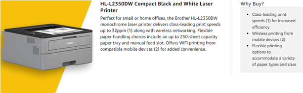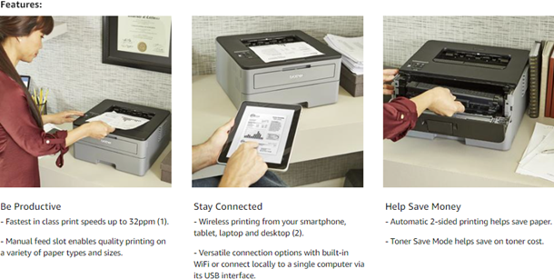 The compact Brother HL-L2350DW laser printer is a great choice for the busy home or small office. It delivers class leading print speeds of up to 32 pages per minute¹ and automatic duplex (two-sided) printing for increased efficiency. Connect with versatile options including built-in wireless² or USB interface and print wirelessly from mobile devices.² The 250-sheet paper capacity helps improve efficiency with fewer refills and handles letter or legal sized paper. Brother Genuine high-yield replacement cartridges deliver up to twice the standard print volume to help lower printing costs.³ Comes with a 1-year limited warranty and free online, call or live chat support for the life of your product.