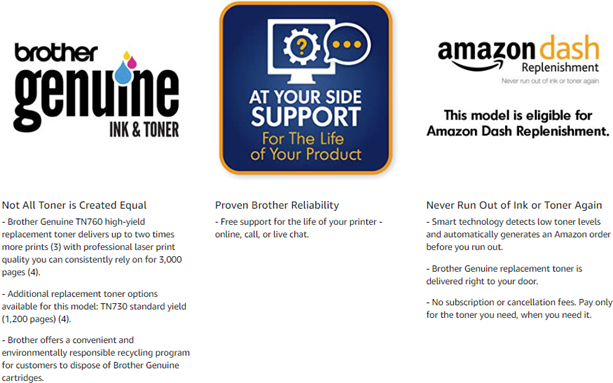 Based on competing in-class monochrome laser printers under $200. Print speed specifications gathered from manufacturer websites as of 1/9/2017.Requires connection to a wireless network.TN-760 High Yield vs. TN-730 Standard Yield. Up to two times more prints and lower printing costs based on yields and MSRP. Standard Yield and High-yield cartridges sold separately. Approx. toner cartridge yield in accordance with ISO/IEC 19752 (letter/A4).Reprinted from PCMag with permission. Copyright 2017 Ziff Davis, LLC. All Rights Reserved.Approx. 300 pages per month in accordance with ISO/IEC 19752 (Letter/A4) using the 2 toners provided in box.Requires additional purchaseThe mobile device must have NFC capability and run Android OS 4.4 or later.