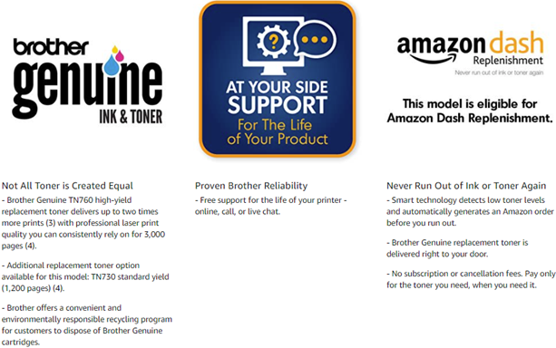 • Save up to 50% on toner with Refresh EZ Print Subscription Service(1). For one low monthly payment, get Brother Genuine Toner delivered right to your door, before you need it.  Up to 4 months free trial included(2).  Plus get 1,000 bonus pages when you enroll within 7 days of setup