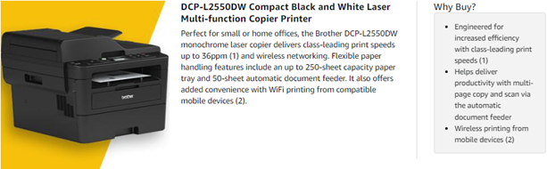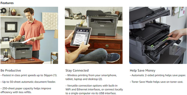 The Brother DCP L2550DW is the ideal choice for the busy home or small office looking for a fast, reliable multi function copier. A replacement for the dependable DCP L2540DW, this new and improved multiple use copier includes a 50 sheet automatic document feeder, which allows multi page copying and scanning, and class leading print speeds of up to 36 pages per minute for increased efficiency. This printer and copier has a reliable Wi Fi connection, which allows printing from wireless devices including desktops, smartphones, laptops, and tablets. For those who prefer hardwire connections, there’s an Ethernet interface for sharing with multiple users on your network. You can also connect locally to a single computer via USB interface. Operating Environment: Temperature 50-91°F. Speed and efficiency are trademarks of the new Brother DCP L2550DW multi purpose digital copier. The 250 sheet paper tray handles letter and legal sized paper, reducing the need for refills. Automatic duplex (2 sided) printing also saves paper and creates professional looking documents for presentations, newsletters, and other common office needs. Help to save money by using Brother Genuine high yield replacement cartridges (TN 760), which are available through Amazon (also compatible with TN 730 replacement toner cartridge). The Brother Digital Multi Purpose Copier comes with a one year limited warranty and free at your side support, online or via phone or live chat, for the life of your printer. At Brother, we want to ensure that your experience with us is exceptional. If your home or small office is looking for an efficient and user friendly digital copier, add the Brother DCP L2550DW to your Amazon shopping cart today. (1) Based on competing in class monochrome laser multifunction printers under 300 dollars. Print speed specifications gathered from manufacturer websites as of 1/9/2017.(2) Requires connection to a wireless network.(3) TN 760 High Yield vs. TN 730 Standard Yield. Up to two times more prints and lower printing costs based on yields and MSRP. Standard Yield and High yield cartridges sold separately.(4) Approx. toner cartridge yield in accordance with ISO/IEC 19752 (letter/A4).(5) Reprinted from PCMag with permission. Copyright 2017 Ziff Davis, All Rights Reserved.(6) Approx. 300 pages per month in accordance with ISO/IEC 19752 (Letter/A4) using the 2 toners provided in box.(7) The mobile device must have NFC capability and run Android OS 4.4 or later.