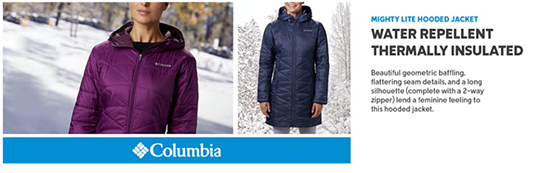 • COZY WINTER JACKET: The Columbia Women’s Mighty Light Hooded Jacket is a performance blend of advanced water repellency and ultra lightweight warmth that only our thermal heat reflective lining can provide. Your go-to coat for a wide range of adventure