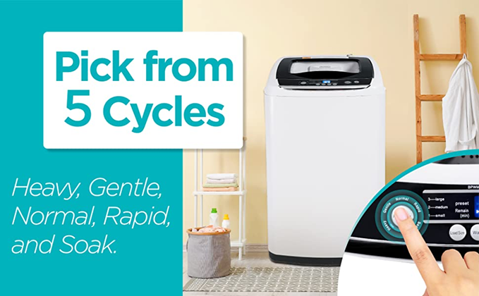 Not all loads of laundry require the same attention, which is why you have 5 cycles to choose from on this small washing machine: Heavy, Gentle, Normal, Rapid, and Soak.