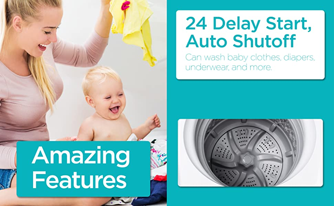 Enjoy additional capabilities on this portable washer machine, including 24 Delay Start, Auto Shutoff, and Child Lock. Because this is an impeller washer, you can even launder baby clothing, diapers, as well as lingerie without entanglement problems.