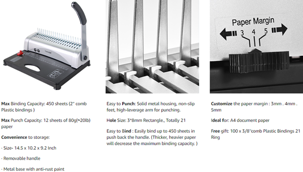 - 【Great Value for Money】: Our binding machine comes with 100pcs of 3/8'' 21-ring black PVC comb spines starter kit, no need to buy separately, save your money. Solid metal housing, non-slip feet, high-leverage arm for punching. Manually punches up to 12 sheets of 80g(paper thickness≈20lb) paper at a time, binds up to 450 sheets. (2'' comb plastic bindings)