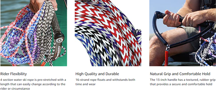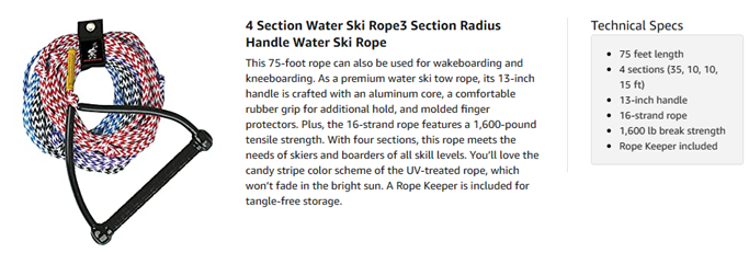 • 75-foot, 4 section water ski rope can also be used for wakeboarding and kneeboarding