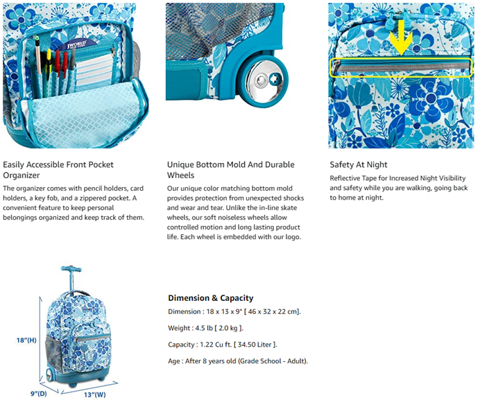 This rolling backpack for women and men converts from a rolling back on wheels into a wearable backpack with shoulder straps. Features a large main compartment, 2 mesh side pockets and a front pocket organizer. Measuring 18 x 13 x 9 inches, this backpack is also designed to be used as an underseat carry on bag for airplane travel. The single-tube aluminum handle extends to 34 or 39 inches for easy maneuverability by kids and adults up to 6’ 3” tall. Telescoping handle stores nested in bag. Molded rubber bottom holds up to the punishment of dragging on pavement. No more holes in the bottom of your kids rolling backpack! Made of durable ripstop polyester fabric with a metal frame and reinforced edges, this rolling backpack for boys and girls has a water resistant coating to keep your gear dry. Reflective tape gives night visibility. Features cushioned air mesh shoulder straps and back pad, or use the padded handle to carry this rolly backpack for girls and boys. This bag with wheels for kids and adults quickly converts into a wearable backpack when going up stairs or over rough ground, just pull out backpack straps. To convert back to a rolling travel backpack, simply tuck the straps away in the back pocket—no having to unzip. Large rubber backpack wheels roll and turn effortlessly on sidewalks, paths and airplane aisles. Corner mounted wheels provide extra stability. Our Promise - at J World New York, we stand behind our products 100%. If you have any issues with this rolling backpack for girls and boys, we will make things right