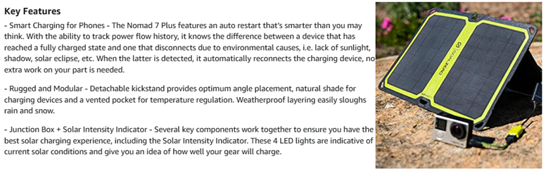 • The Nomad 7 Plus features an auto restart that s smarter than anything else on the market. With the ability to track power flow history, The Nomad 7 Plus knows the difference between a device that has reached a fully charged state and one that disconnects due to environmental causes, I. E. Lack of sunlight, shadow, etc