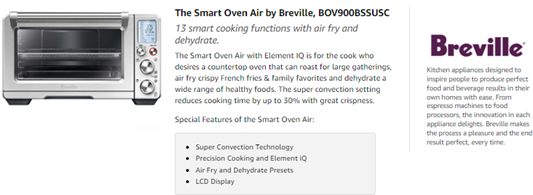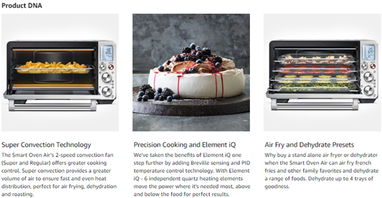 • The Breville Smart Oven Air with Element iQ System is a versatile countertop oven allowing you to roast, air fry and dehydrate; Use super convection to reduce cooking time by up to 30% and choose from 13 cooking functions; Includes an interior oven light.Temperature : 80-480 °F