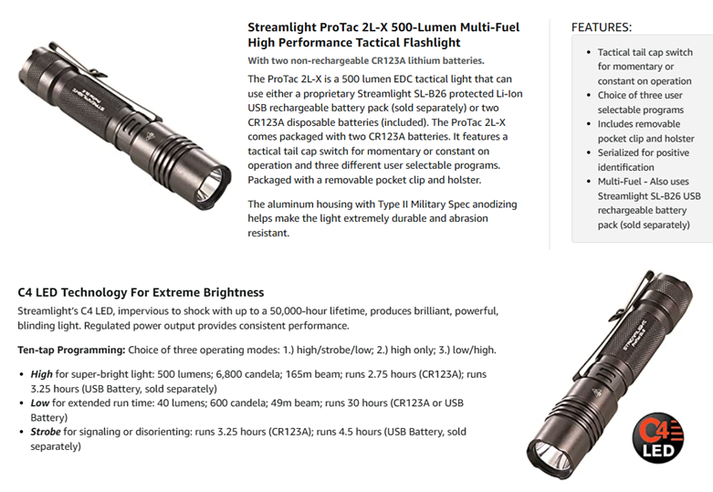 The 500 lumen ProTac 2L-X is an EDC light. It is a complete rechargeable system that includes two CR123A lithium batteries. Multi-fuel innovation allows it to accept Streamlight’s USB battery (sold separately) or CR123A lithium batteries, ensuring you’ll always have a beam when you need it. The aluminum housing with Type II Military Spec anodizing helps make the lights extremely durable and abrasion resistant.