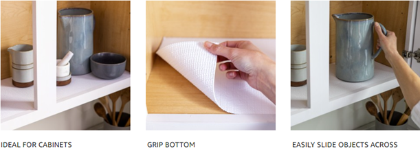 You do a lot to organize, decorate and protect your home from life's unwanted messes. Easy liner brand shelf liner does all three in a simple and affordable way. Smooth top easy liner brand shelf liner provides an easy-to-clean surface for cabinets in your kitchen, bath and laundry room. The non-adhesive grip bottom keeps the shelf liner in place and doesn’t leave a sticky residue, while the smooth top lets you easily slide objects across. With a variety of colors and trendy patterns, you can bring new life to cabinets – just cut, apply to your surface and style away.