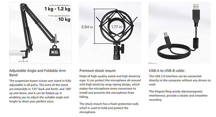 Compatible Devices | For all Laptops, PC and Mobile phones. But if you want to connect with the phone, you need an OTG adapter (not included). Strong output, no distortion, low power consumption. PACKING LIST: Condenser Mic + Adjustable Scissor Arm Stand + Metal Shock Mount + Pop Filter + Foam Mic Windscreen + Table Mounting Clamp + USB-B to USB-A Cable. |