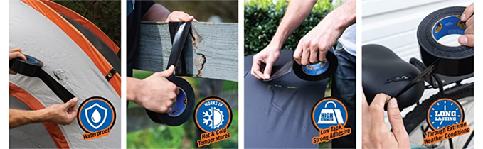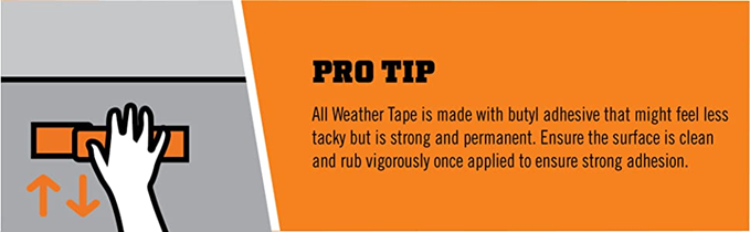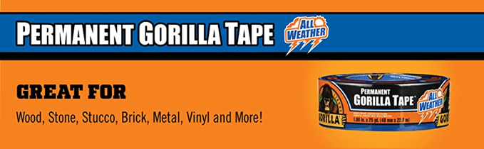 Gorilla All Weather Waterproof Tape is an ideal solution for outdoor repairs. Made with incredibly strong, permanent, butyl adhesive and a weather resistant shell, this tape withstands even extreme weather conditions. Gorilla All Weather Tape resists drying, cracking, and peeling caused by sunlight, heat, cold, and moisture and works in both hot & cold temperatures. Use like any other tape. Tear Gorilla Tape by hand or cut to size with a knife or scissors. Apply the tape carefully, smoothing out any pockets or rolls. That’s it. Enjoy the strength and durability of Gorilla Tape! For best results, apply to a clean surface free of dust, dirt, and debris. Great for tarps, plastic sheeting, roofs, vents, RV's, and all general purpose heavy duty repairs. Gorilla All Weather Tape contains a highly concentrated rubber based adhesive and sticks to most plastics, including polyethylene (PE) and polypropylene (PP). Gorilla All Weather Tape does not work on materials with high oil or plasticizer content, such as EPDM rubber or PVC. An acrylic tape, such as Crystal Clear Gorilla Tape, may be better suited for these materials. Gorilla All Weather Tape should NOT be used as an electrical tape. Store tape flat on a non-delicate surface. Click on the Gorilla link at the top of this page to visit the Gorilla brand store.