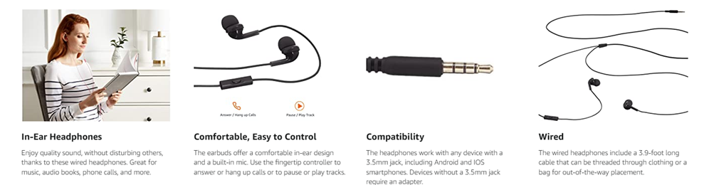 Amazon Basics In-Ear Wired Headphones, Earbuds with Microphone, Black