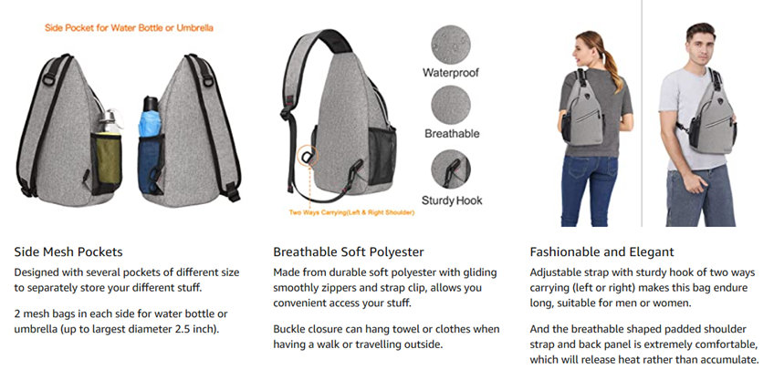 - Made of durable and soft polyester material with gliding smoothly zippers and strap clip, allows you convenient access to your stuff. 1 year warranty on every sling bag.