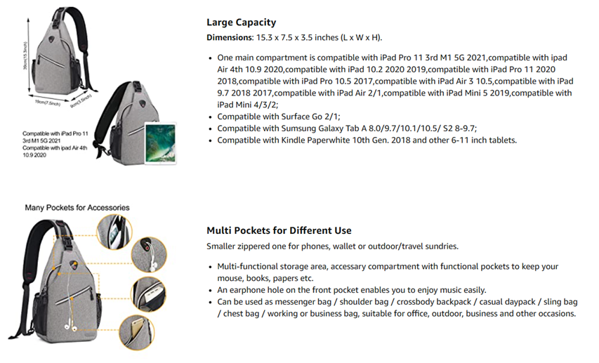 This MOSISO protective sling backpack will protect your tablet, cellphones and other accessories from unwanted bumps, scrapes and knocks. Made from polyester material, slim, light weight, which is durable, not esaily broken. The exclusive trendy design also gives your stuff a functional yet fashionable look, enables you to carry your stuff in a uniquely sleek style.