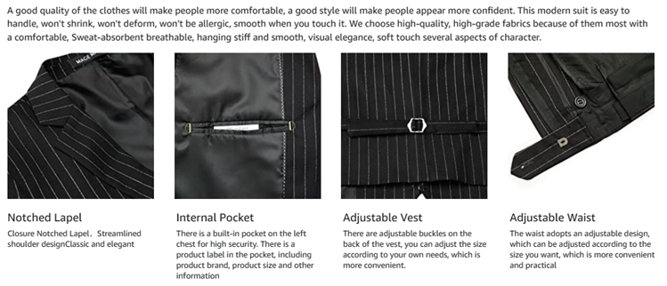 • Button Fly closure, slim fit notch lapel flap pocket. Premium center vent two-button single breasted stripe suit jacket with matched four-button vest with back adjustable belt for better fit and classic trousers.