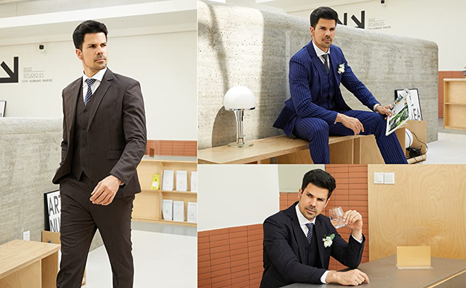 MAGE MALE Men’s Pinstripe 3 Piece Suit Slim Fit Elegant Single Breasted Business Wedding Party Blazer Vest& Pants Set