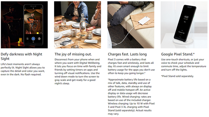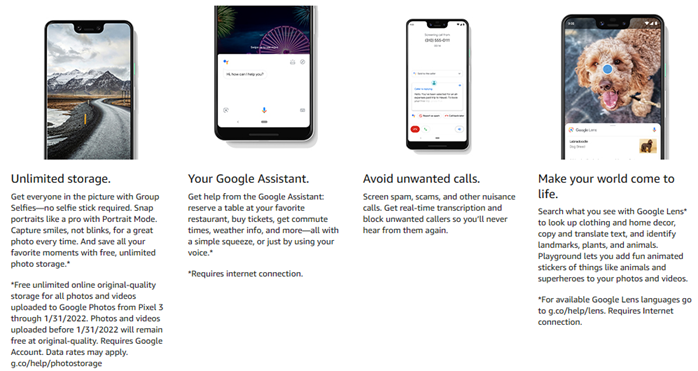 Meet the Google Pixel 3. Capture the perfect shot every time, get things done with the Google Assistant, enjoy an all-day battery, and more. A camera so good it deserves unlimited storage. Get everyone in the picture with Group Selfies—no selfie stick required. Snap portraits like a pro with Portrait Mode. Capture smiles, not blinks, for a great photo every time. And save all your favorite moments with free, unlimited photo storage. Charges fast. Lasts long. Pixel 3 comes with a battery that charges fast and wirelessly, and lasts all day. It's even smart enough to limit battery usage for the apps you don't use often to keep you going longer. Your Google Assistant. Get help from the Google Assistant: reserve a table at your favorite restaurant, buy tickets, get commute times, weather info, and more—all with a simple squeeze, or just by using your voice. Avoid unwanted calls. Screen spam, scams, and other nuisance calls. Get real-time transcription and block unwanted callers so you’ll never hear from them again. The joy of missing out. Disconnect from your phone when and where you want with Digital Wellbeing. It lets you focus on time with family and friends by setting timers on apps and turning off visual notifications. Use the wind down mode to turn the screen to gray scale and get ready for a good night's sleep.