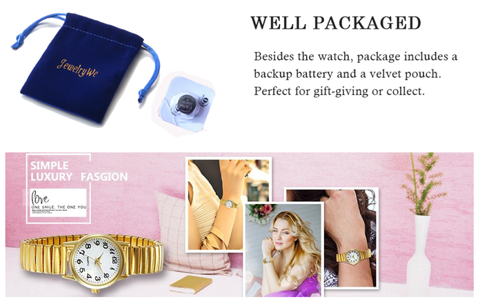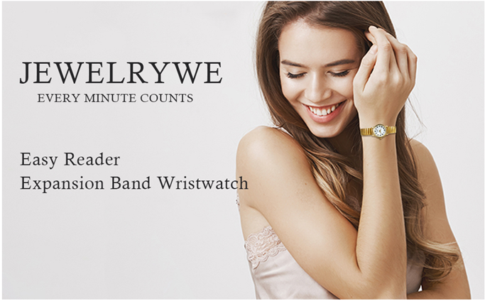 Highlights:Modern quartz movement makes the watch a precise time keeper.Distinct hands with Arabic numerals for a easy reader dial.The strap is comfortable to wear.Elastic strap for easy take on and off, very convenient, and fit all size wrists.This fashion watch offers women of all ages with a unique casual look.It looks great and more importantly keeps accurate time.Dress up your work attire and be on time for your meetings.Every watch comes with a blue velvet gift bag printed ?¡ãJewelryWe?¡À on it.